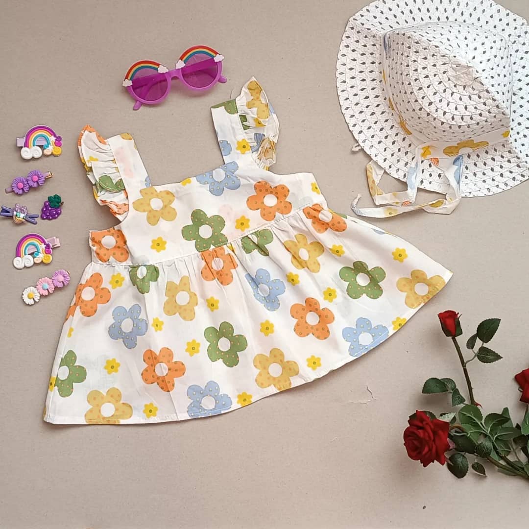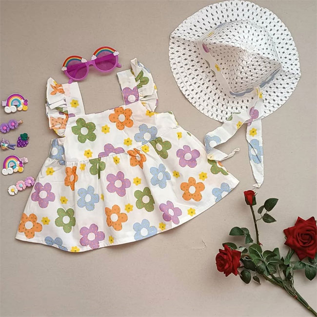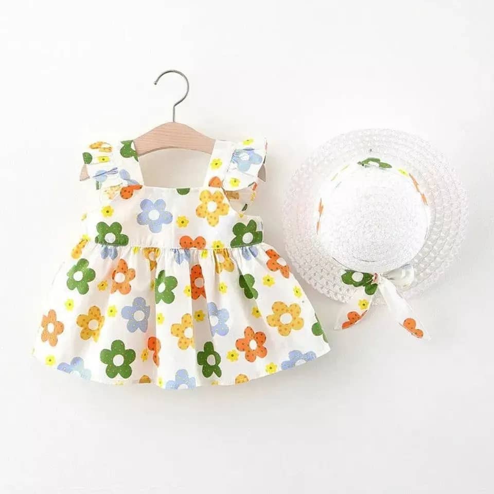 ست پیراهن و کلاه حصیری گل گلی